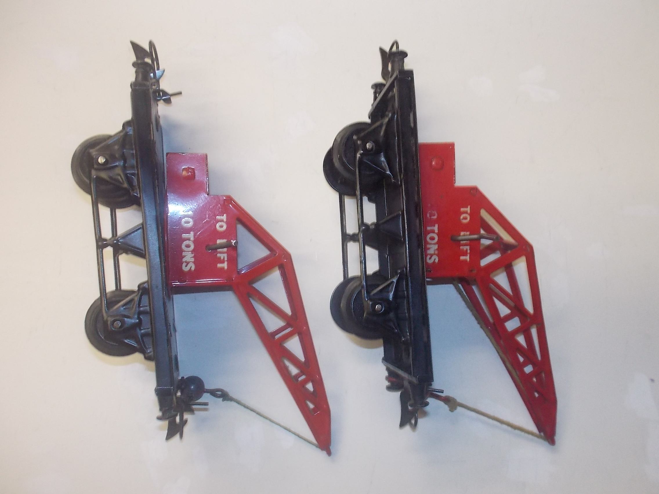 For Sale, Two pieces, O gauge No. 1 Crane Trucks, 10 Ton. 1 with red hook, 1 with black hook. $35.00 for both plus shipping. Will trade for Lionel of Marx items.